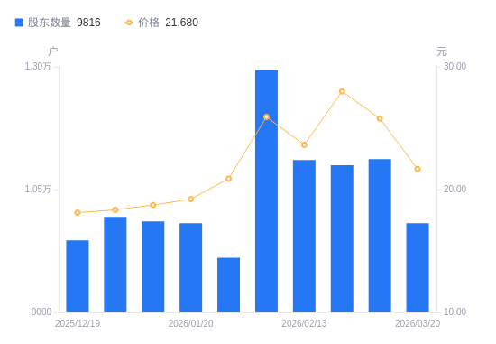 3月24日消息,数据显示,截至2026年3月20日,致远新能A股股东总户数为9816户,较上期(2026年3月10日)减少1304户,降幅11.73%。公司最新A股总股本为1.87亿股,其中流通A股1.87亿股,户均持有流通A股数量为1.9万股,较上期增加2228.16股,增幅13.28%;户均持流通A股市值41.19万元,较上期减少2.06万元,降幅4.77%。