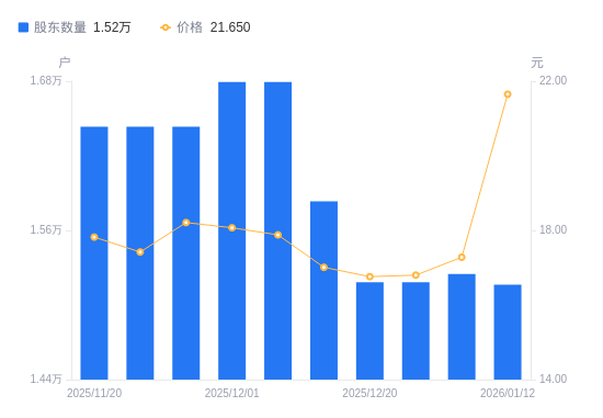1月12日消息,数据显示,截至2026年1月12日,川网传媒A股股东总户数为1.52万户,较上期(2026年1月6日)减少85户,降幅0.56%。公司最新A股总股本为1.73亿股,其中流通A股1.73亿股,户均持有流通A股数量为1.14万股,较上期增加63.73股,增幅0.56%;户均持流通A股市值24.75万元,较上期增加5.11万元,增幅25.99%。