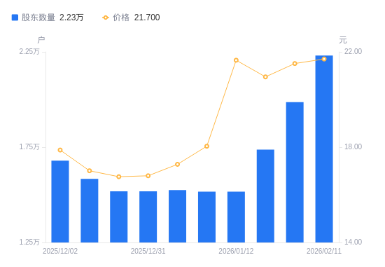 近一年(2025年2月28日至2026年2月11日),川网传媒A股股东户数从1.44万户,增加至2.23万户,增幅54.66%,区间股价上涨31.71%。