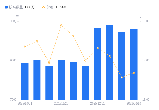 2月11日消息,数据显示,截至2026年2月10日,蕾奥规划A股股东总户数为1.06万户,较上期(2026年1月30日)增加157户,增幅1.50%。公司最新A股总股本为2.11亿股,其中流通A股1.46亿股,户均持有流通A股数量为1.38万股,较上期减少207.75股,降幅1.48%;户均持流通A股市值22.64万元,较上期减少176.87元,降幅0.08%。