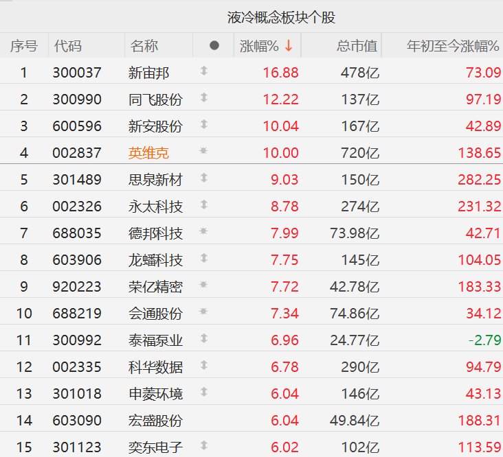 格隆汇11月13日|A股市场液冷概念股表现强势,其中,新宙邦涨超16%,同飞股份涨超12%,新安股份、英维克10CM涨停,思泉新材涨9%,永太科技涨超8%,德邦科技、龙蟠科技、荣亿精密、会通股份涨超7%,泰福泵业、科华数据、申菱环境、宏盛股份、奕东电子涨超6%。消息面上,摩根士丹利最新发布的报告显示,下一代Vera Rubin NVL144平台的散热总价将更高,预计每个机柜的冷却组件总价值将增长17%,达到约55710美元(约合人民币近40万元)。