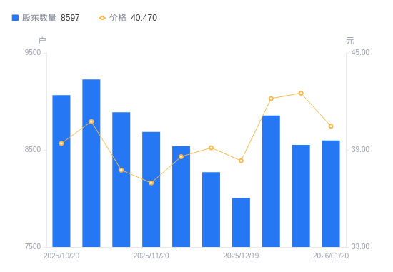 近一年(2025年1月27日至2026年1月20日),创益通A股股东户数从1.7万户,减低至8597户,降幅49.35%,区间股价上涨94.29%。