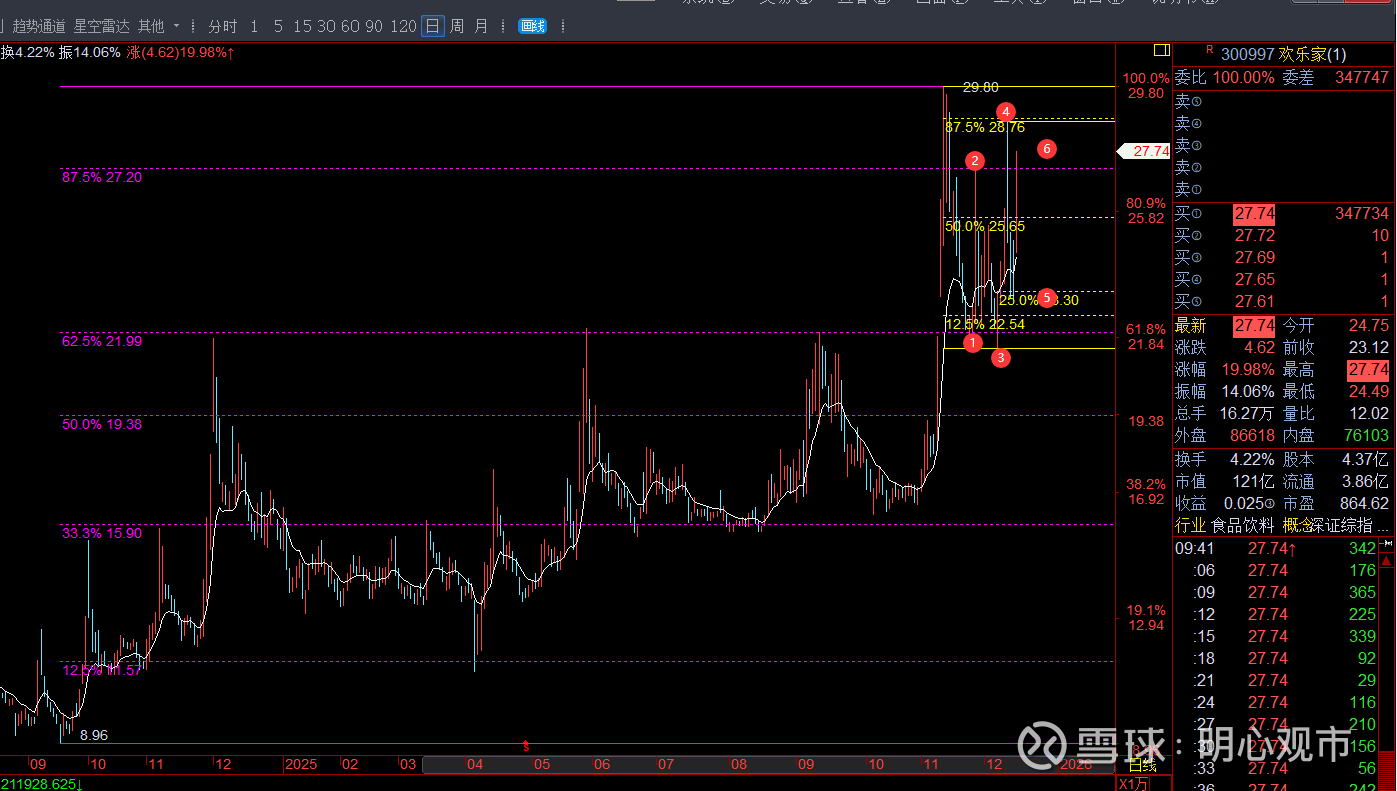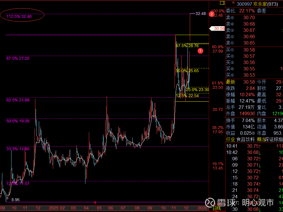 直接高开过去28.76后,按规则前高刷新看扩展125位,今天32.48的高点,基本也就是刚好触及该比例位回落