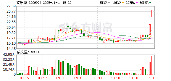 11月11日,欢乐家(300997)发布公告,公司股票在2025年11月7日、10日和11日连续3个交易日,收盘价格涨幅偏离值累计超过30%。