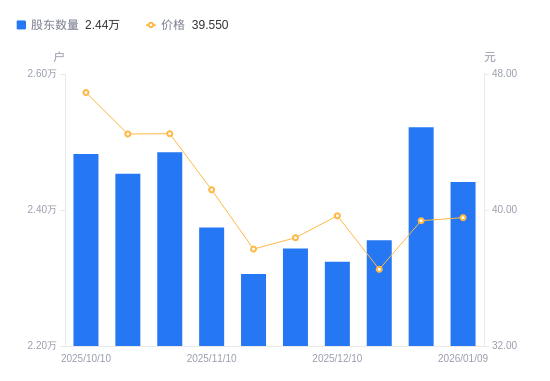 近一年(2025年1月10日至2026年1月9日),肇民科技A股股东户数从3.23万户,减低至2.44万户,降幅24.36%,区间股价上涨40.15%。