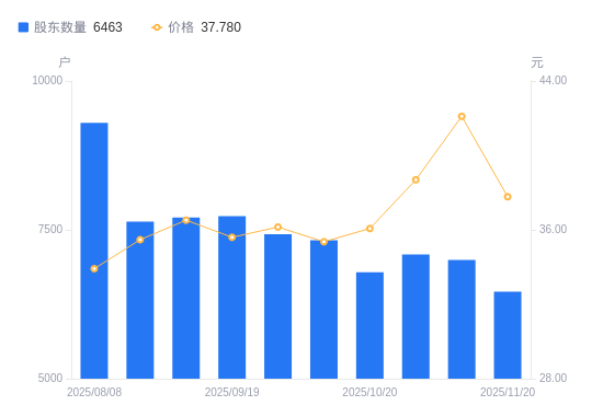 11月21日消息,数据显示,截至2025年11月20日,江苏博云A股股东总户数为6463户,较上期(2025年11月10日)减少533户,降幅7.62%。公司最新A股总股本为9713.33万股,其中流通A股7461.01万股,户均持有流通A股数量为1.15万股,较上期增加879.51股,增幅8.25%;户均持流通A股市值43.61万元,较上期减少1.28万元,降幅2.86%。