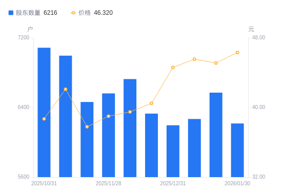 近一年(2025年2月10日至2026年1月30日),江苏博云A股股东户数从7739户,减低至6216户,降幅19.68%,区间股价上涨120.06%。