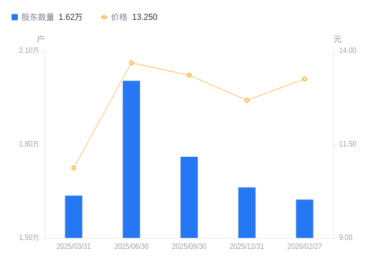 近一年(2025年3月31日至2026年2月27日),可靠股份A股股东户数从1.64万户,减低至1.62万户,降幅0.78%,区间股价上涨14.21%。