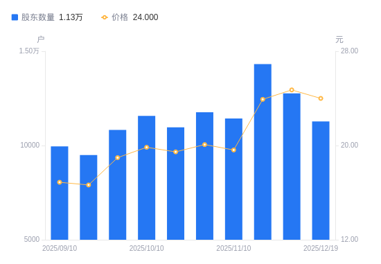 近一年(2024年12月20日至2025年12月19日),宁波色母A股股东户数从8778户,增加至1.13万户,增幅28.43%,区间股价上涨51.12%。