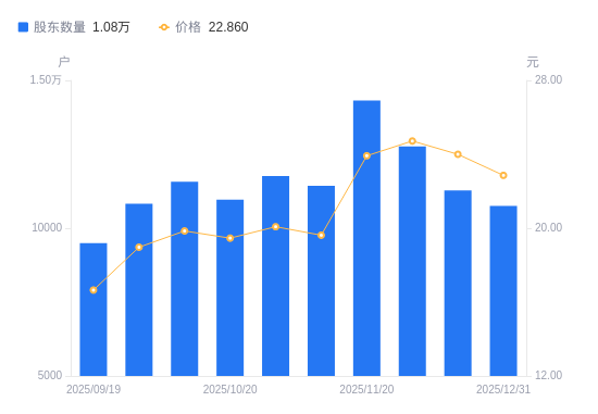 近一年(2024年12月31日至2025年12月31日),宁波色母A股股东户数从9464户,增加至1.08万户,增幅13.62%,区间股价上涨32.90%。