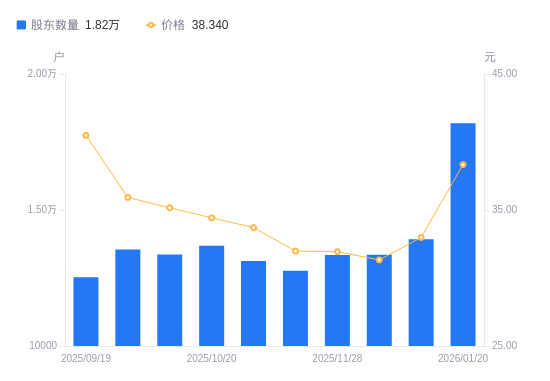 近一年(2025年1月20日至2026年1月20日),海泰科A股股东户数从8340户,增加至1.82万户,增幅118.11%,区间股价上涨94.52%。