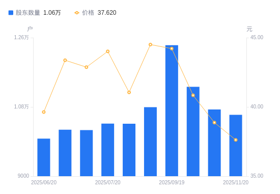 11月24日消息,数据显示,截至2025年11月20日,江南奕帆A股股东总户数为1.06万户,较上期(2025年11月10日)减少139户,降幅1.30%。公司最新A股总股本为7816.66万股,其中流通A股4180.61万股,户均持有流通A股数量为3946.2股,较上期增加51.11股,增幅1.31%;户均持流通A股市值14.85万元,较上期减少2946.26元,降幅1.95%。