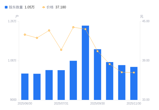 近一年(2024年11月30日至2025年11月30日),江南奕帆A股股东户数从7423户,增加至1.05万户,增幅41.61%,区间股价上涨5.28%。