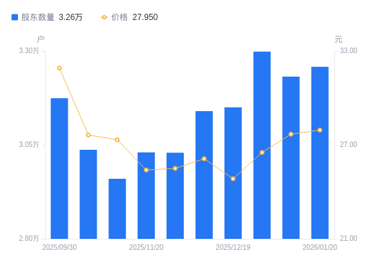 近一年(2025年1月20日至2026年1月20日),怡合达A股股东户数从1.71万户,增加至3.26万户,增幅90.87%,区间股价上涨12.02%。