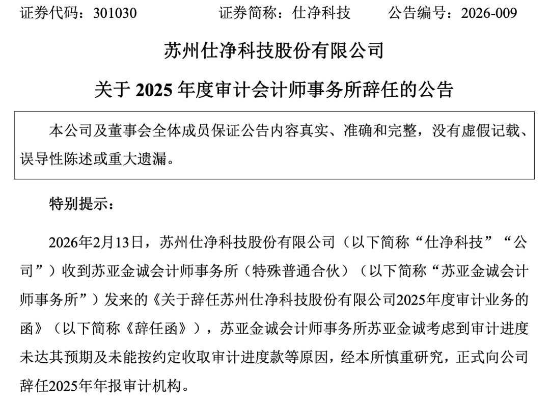 2月25日晚间,仕净科技(301030)披露公告称,苏亚金诚会计师事务所(特殊普通合伙)(以下简称“苏亚金诚”)于2月13日递交《辞任函》,辞任2025年年报审计机构。