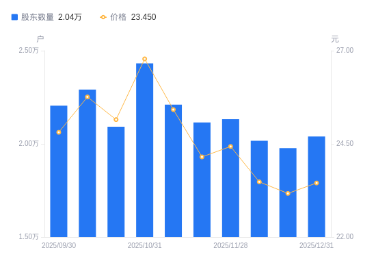 1月4日消息,数据显示,截至2025年12月31日,深水规院A股股东总户数为2.04万户,较上期(2025年12月19日)增加624户,增幅3.16%。公司最新A股总股本为2.23亿股,其中流通A股2.23亿股,户均持有流通A股数量为1.09万股,较上期减少345.15股,降幅3.06%;户均持流通A股市值25.65万元,较上期减少4934.76元,降幅1.89%。