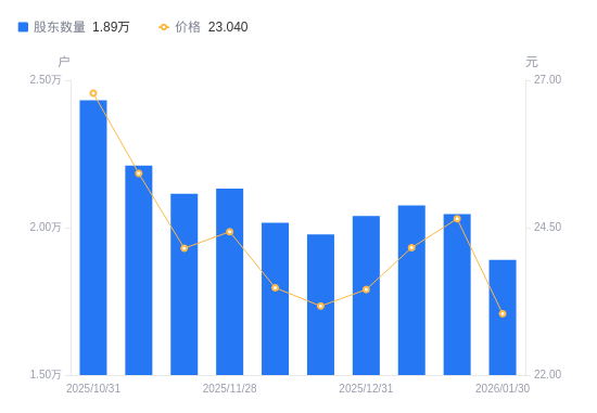 2月2日消息,数据显示,截至2026年1月30日,深水规院A股股东总户数为1.89万户,较上期(2026年1月20日)减少1552户,降幅7.59%。公司最新A股总股本为2.23亿股,其中流通A股2.23亿股,户均持有流通A股数量为1.18万股,较上期增加895.32股,增幅8.21%;户均持流通A股市值27.19万元,较上期增加3070.53元,增幅1.14%。