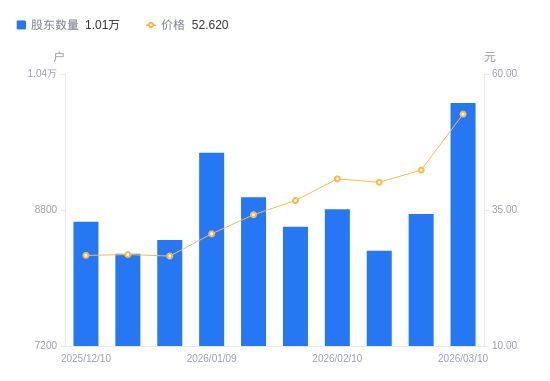 3月19日消息,数据显示,截至2026年3月10日,天禄科技A股股东总户数为1.01万户,较上期(2026年2月27日)增加1308户,增幅14.95%。公司最新A股总股本为1.1亿股,其中流通A股6395.8万股,户均持有流通A股数量为6357.65股,较上期减少950.16股,降幅13.00%;户均持流通A股市值33.45万元,较上期增加2.52万元,增幅8.15%。