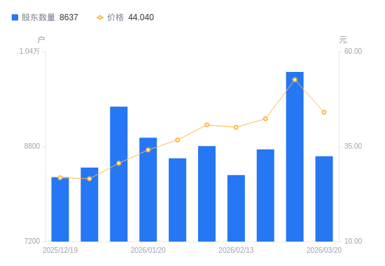 3月24日消息,数据显示,截至2026年3月20日,天禄科技A股股东总户数为8637户,较上期(2026年3月10日)减少1423户,降幅14.15%。公司最新A股总股本为1.1亿股,其中流通A股6395.8万股,户均持有流通A股数量为7405.12股,较上期增加1047.46股,增幅16.48%;户均持流通A股市值32.61万元,较上期减少8418.38元,降幅2.52%。