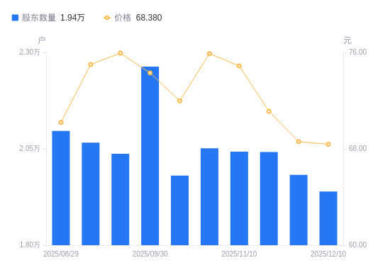 12月17日消息,数据显示,截至2025年12月10日,义翘神州A股股东总户数为1.94万户,较上期(2025年11月28日)减少430户,降幅2.17%。公司最新A股总股本为1.22亿股,其中流通A股1.2亿股,户均持有流通A股数量为6166.17股,较上期增加133.76股,增幅2.22%;户均持流通A股市值42.16万元,较上期增加7819.14元,增幅1.89%。