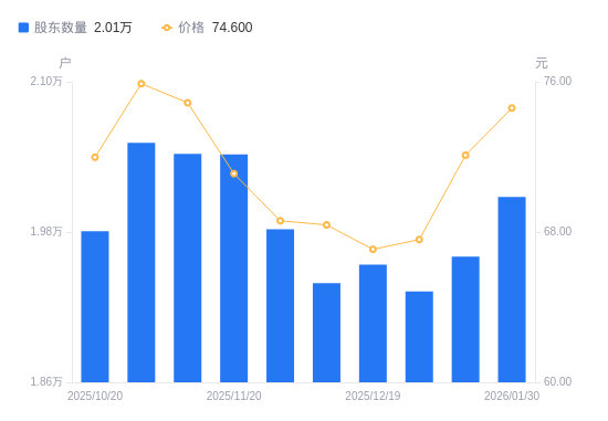 近一年(2025年2月20日至2026年1月30日),义翘神州A股股东户数从2.04万户,减低至2.01万户,降幅1.50%,区间股价上涨29.56%。