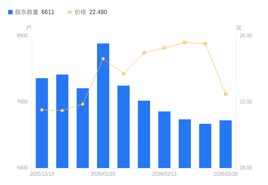 近一年(2025年3月31日至2026年3月20日),超越科技A股股东户数从8045户,减低至6611户,降幅17.82%,区间股价上涨1.86%。