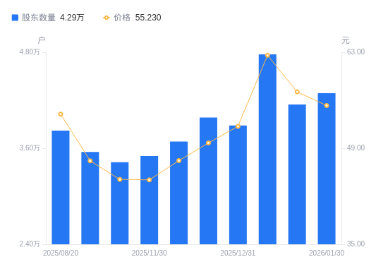 2月3日消息,数据显示,截至2026年1月30日,雷电微力A股股东总户数为4.29万户,较上期(2026年1月20日)增加1411户,增幅3.40%。公司最新A股总股本为2.47亿股,其中流通A股2.1亿股,户均持有流通A股数量为4906.03股,较上期减少166.93股,降幅3.29%;户均持流通A股市值27.1万元,较上期减少1.94万元,降幅6.67%。