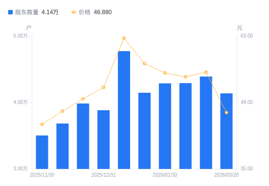 3月28日消息,数据显示,截至2026年3月20日,雷电微力A股股东总户数为4.14万户,较上期(2026年2月27日)减少2532户,降幅5.77%。公司最新A股总股本为2.47亿股,其中流通A股2.1亿股,户均持有流通A股数量为5084.37股,较上期增加293.2股,增幅6.12%;户均持流通A股市值23.84万元,较上期减少2.7万元,降幅10.18%。