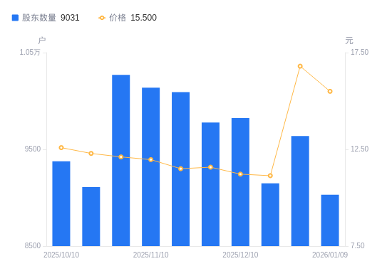 近一年(2025年1月10日至2026年1月9日),森赫股份A股股东户数从1.06万户,减低至9031户,降幅15.04%,区间股价上涨116.78%。