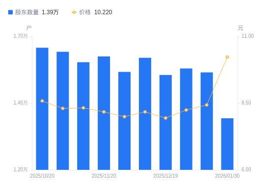 近一年(2025年2月10日至2026年1月30日),上海艾录A股股东户数从1.19万户,增加至1.39万户,增幅16.79%,区间股价下跌6.75%。