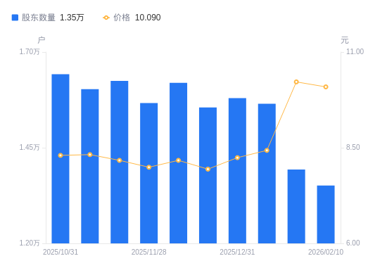 近一年(2025年2月10日至2026年2月10日),上海艾录A股股东户数从1.19万户,增加至1.35万户,增幅13.30%,区间股价下跌7.94%。