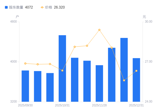 近一年(2024年12月31日至2025年12月31日),大地海洋A股股东户数从2775户,增加至4072户,增幅46.74%,区间股价上涨9.44%。