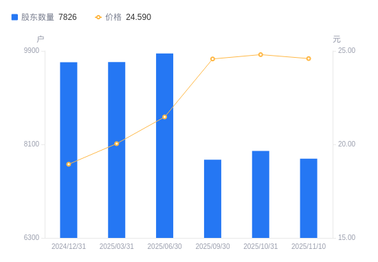 近一年(2024年12月31日至2025年11月10日),中捷精工A股股东户数从9681户,减低至7826户,降幅19.16%,区间股价上涨26.17%。