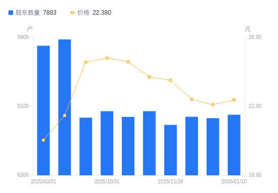 近一年(2025年3月31日至2026年1月10日),中捷精工A股股东户数从9685户,减低至7883户,降幅18.61%,区间股价上涨8.91%。