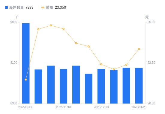 1月21日消息,数据显示,截至2026年1月20日,中捷精工A股股东总户数为7878户,较上期(2026年1月10日)减少5户,降幅0.06%。公司最新A股总股本为1.05亿股,其中流通A股6713.99万股,户均持有流通A股数量为8522.46股,较上期增加5.41股,增幅0.06%;户均持流通A股市值19.9万元,较上期增加8387.76元,增幅4.40%。