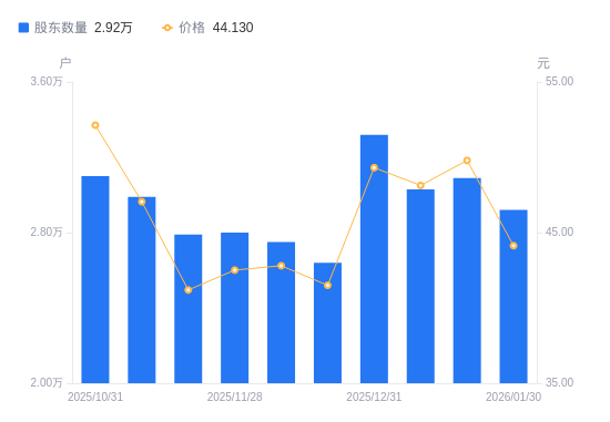 2月2日消息,数据显示,截至2026年1月30日,新瀚新材A股股东总户数为2.92万户,较上期(2026年1月20日)减少1700户,降幅5.50%。公司最新A股总股本为1.75亿股,其中流通A股1.1亿股,户均持有流通A股数量为3760.41股,较上期增加206.88股,增幅5.82%;户均持流通A股市值16.59万元,较上期减少1.1万元,降幅6.21%。