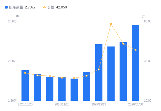近一年(2025年2月10日至2026年1月30日),邵阳液压A股股东户数从1.15万户,增加至2.73万户,增幅137.19%,区间股价上涨163.16%。