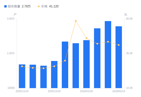 2月25日消息,数据显示,截至2026年2月10日,邵阳液压A股股东总户数为2.94万户,较上期(2026年1月30日)增加2096户,增幅7.69%。公司最新A股总股本为1.09亿股,其中流通A股6952.52万股,户均持有流通A股数量为2368.67股,较上期减少182.15股,降幅7.14%;户均持流通A股市值10.3万元,较上期减少4295.98元,降幅4.01%。