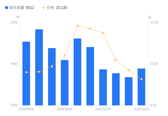 近一年(2024年12月31日至2025年12月31日),严牌股份A股股东户数从9158户,减低至8312户,降幅9.24%,区间股价上涨21.46%。