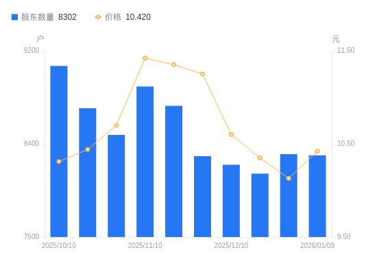 近一年(2025年1月10日至2026年1月9日),严牌股份A股股东户数从8907户,减低至8302户,降幅6.79%,区间股价上涨29.93%。