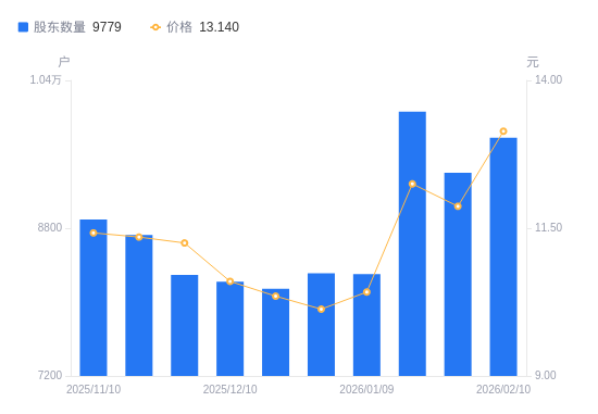 近一年(2025年2月10日至2026年2月10日),严牌股份A股股东户数从8547户,增加至9779户,增幅14.41%,区间股价上涨43.45%。