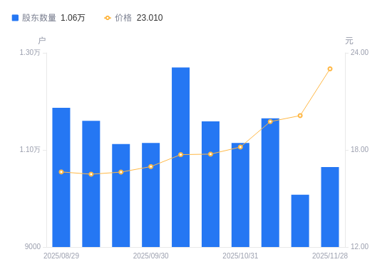 近一年(2024年11月29日至2025年11月28日),百胜智能A股股东户数从1.36万户,减低至1.06万户,降幅21.83%,区间股价上涨49.61%。
