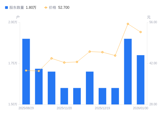 近一年(2025年1月31日至2026年1月30日),可孚医疗A股股东户数1.8万户保持不变,区间股价上涨64.95%。