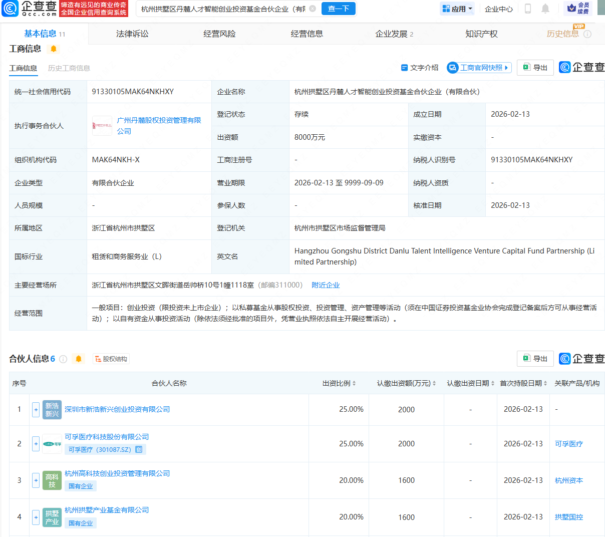 企查查APP显示,近日,杭州拱墅区丹麓人才智能创业投资基金合伙企业(有限合伙)成立,出资额8000万元,经营范围包含:创业投资(限投资未上市企业);以私募基金从事股权投资、投资管理、资产管理等活动等。企查查股权穿透显示,该合伙企业由深圳市新浩新兴创业投资有限公司、可孚医疗(301087)(301087.SZ)、杭州高科技创业投资管理有限公司等共同持股。
