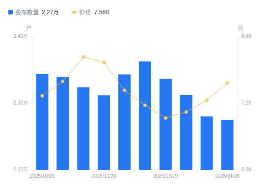 近一年(2025年1月20日至2026年1月20日),华润材料A股股东户数从2.54万户,减低至2.27万户,降幅10.57%,区间股价上涨13.17%。