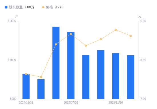 近一年(2024年12月31日至2025年11月20日),金埔园林A股股东户数从9609户,增加至1.08万户,增幅12.56%,区间股价上涨14.73%。