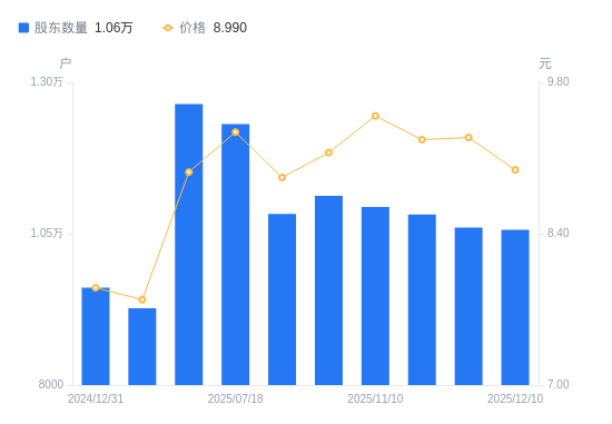近一年(2024年12月31日至2025年12月10日),金埔园林A股股东户数从9609户,增加至1.06万户,增幅9.95%,区间股价上涨11.26%。
