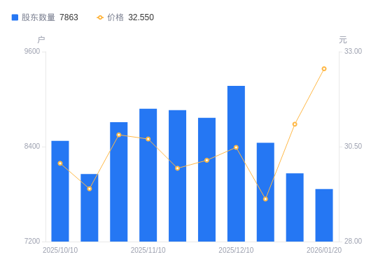 近一年(2025年3月31日至2026年1月20日),骏成科技A股股东户数从9163户,减低至7863户,降幅14.19%,区间股价上涨12.94%。