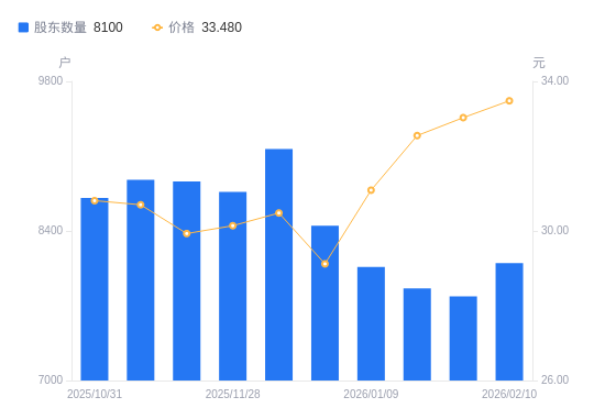 近一年(2025年3月31日至2026年2月10日),骏成科技A股股东户数从9163户,减低至8100户,降幅11.60%,区间股价上涨16.17%。