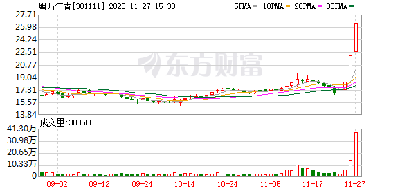 11月27日,粤万年青(301111)发布公告,公司股票在2025年11月25日、26日和27日连续3个交易日,收盘价格涨幅偏离值累计超过30%。